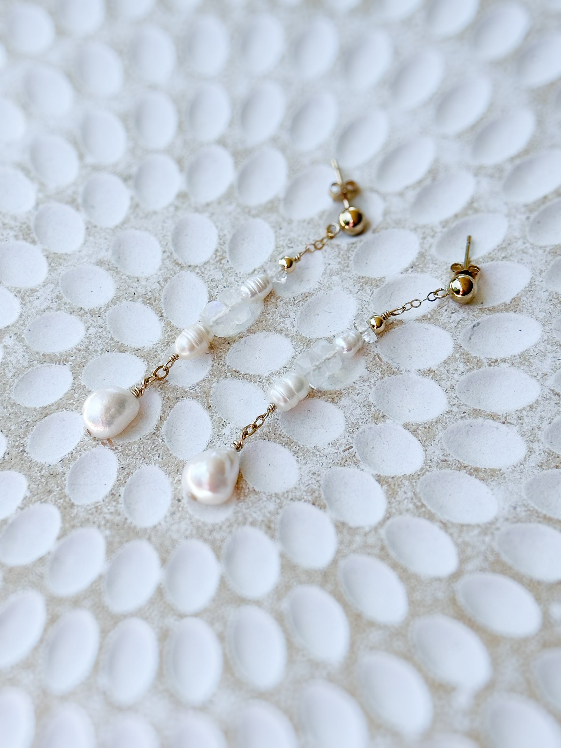Amaya 14K Filled Gold, Herkimer Diamond, Moonstone and genuine Freshwater Pearl Drop Earrings