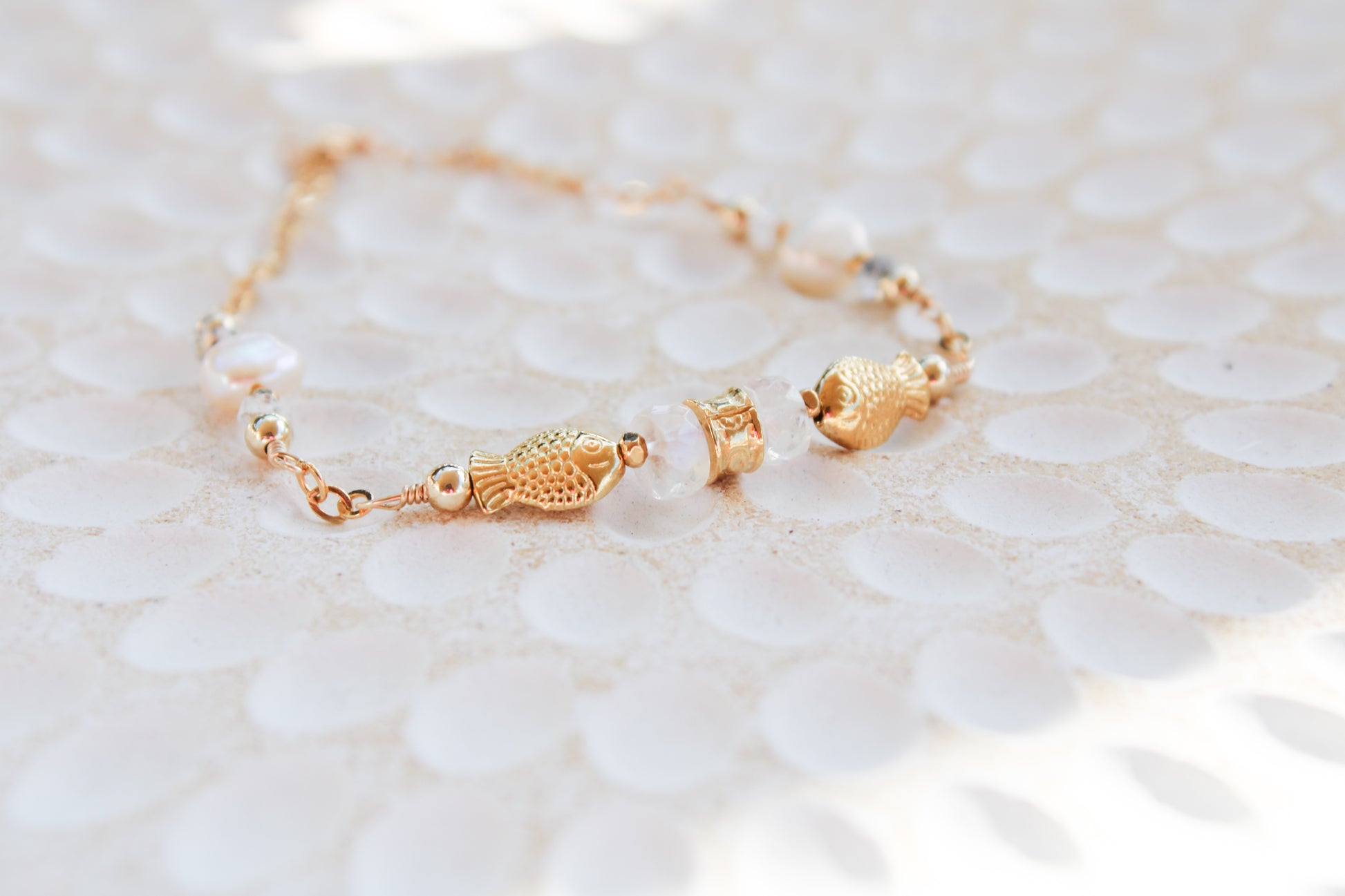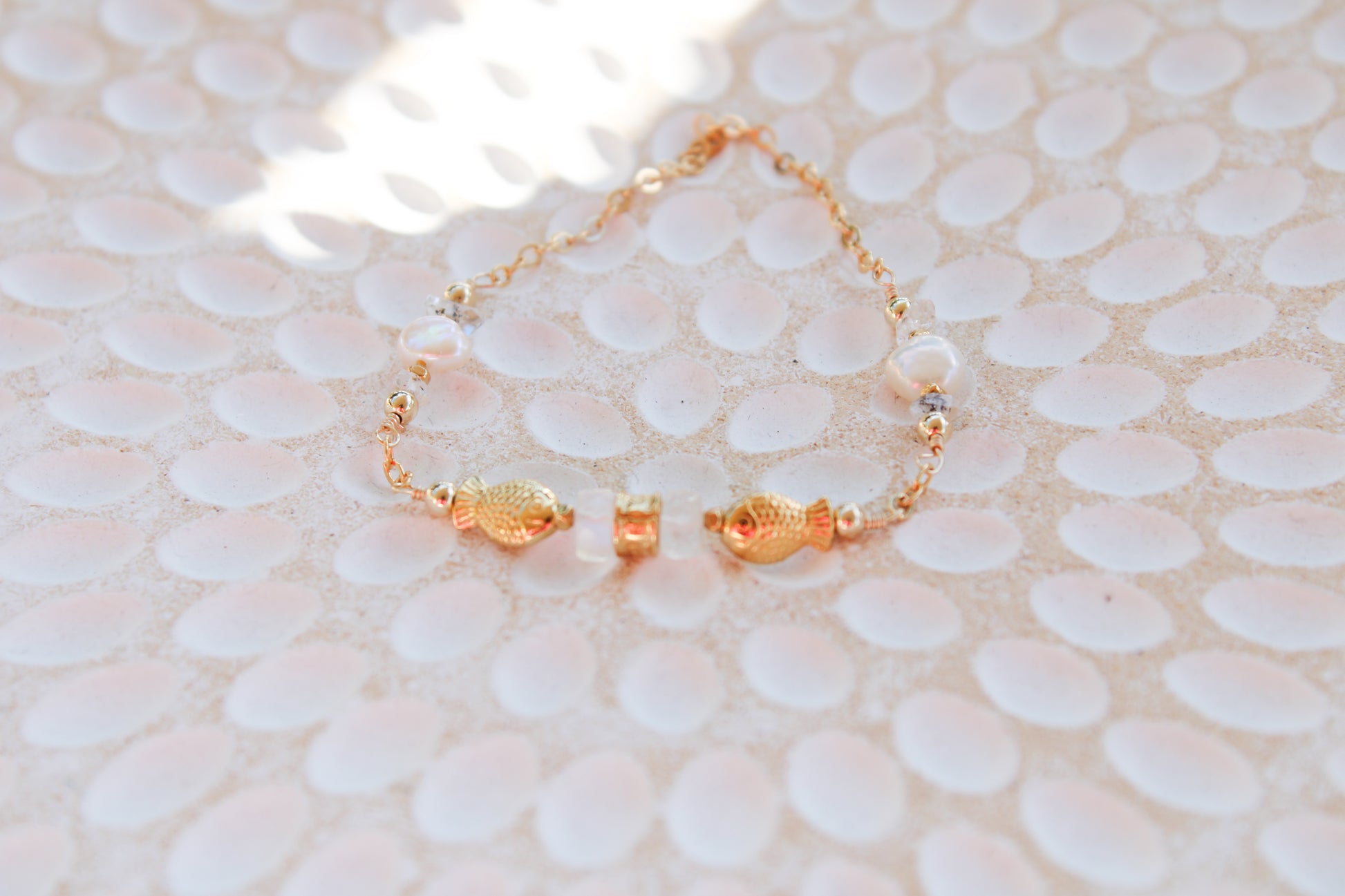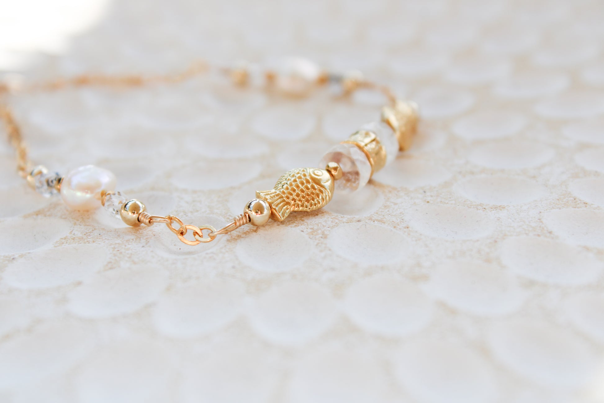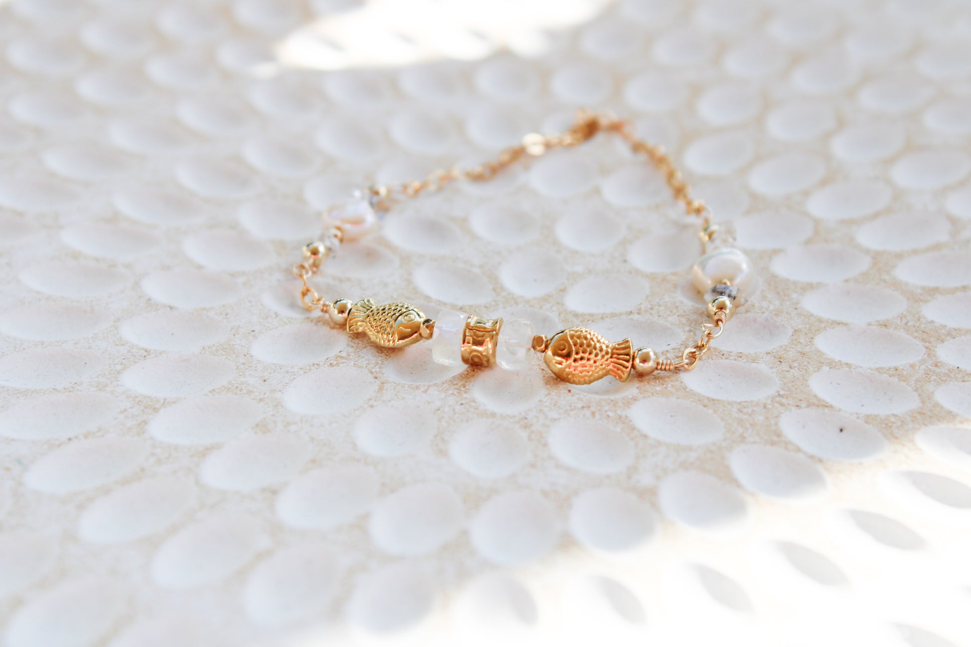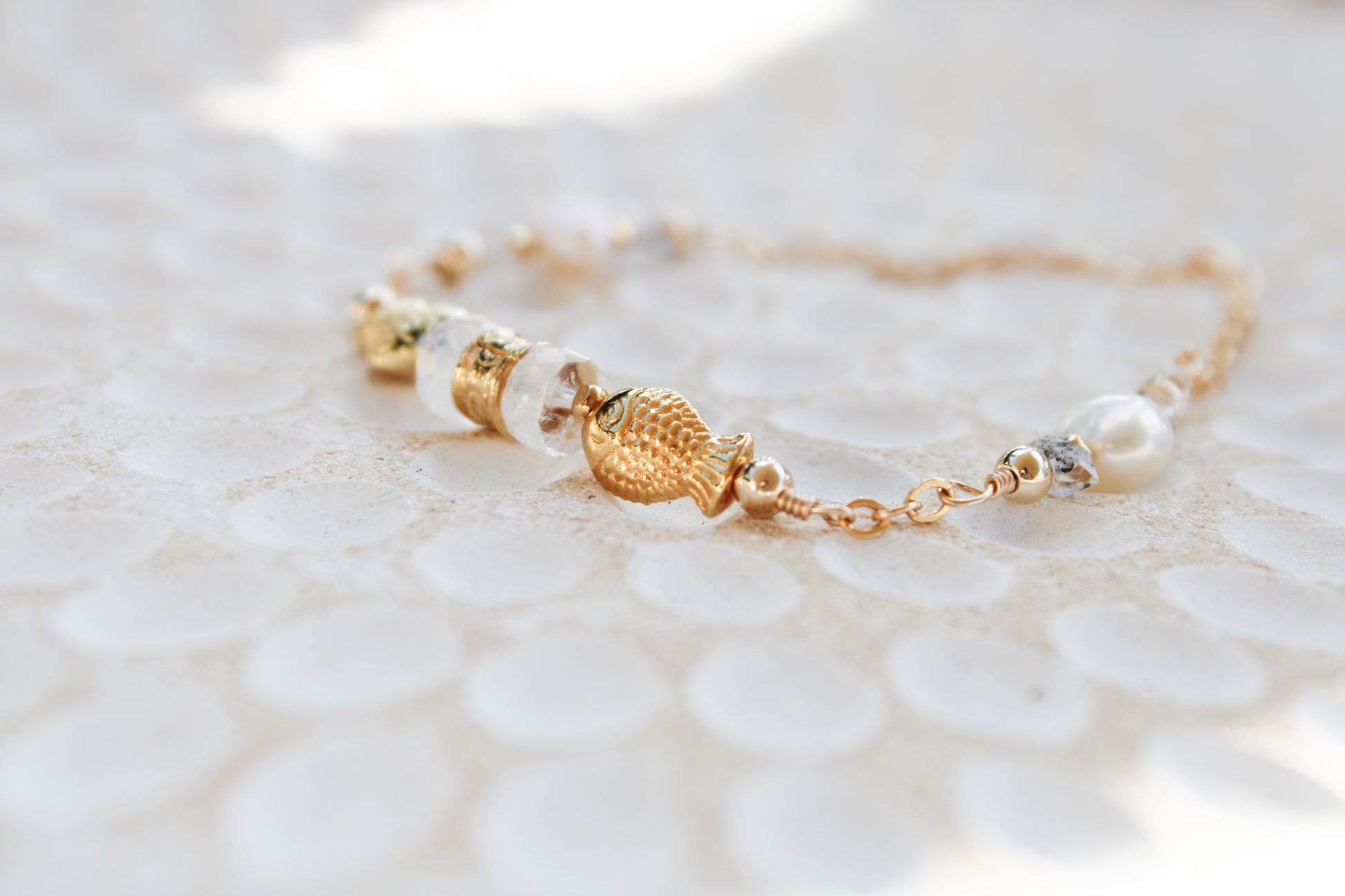 Dagon 14K Filled Gold, Genuine Freshwater Pearl, Moonstone & Herkimer Diamond Tribal Fish Bracelet