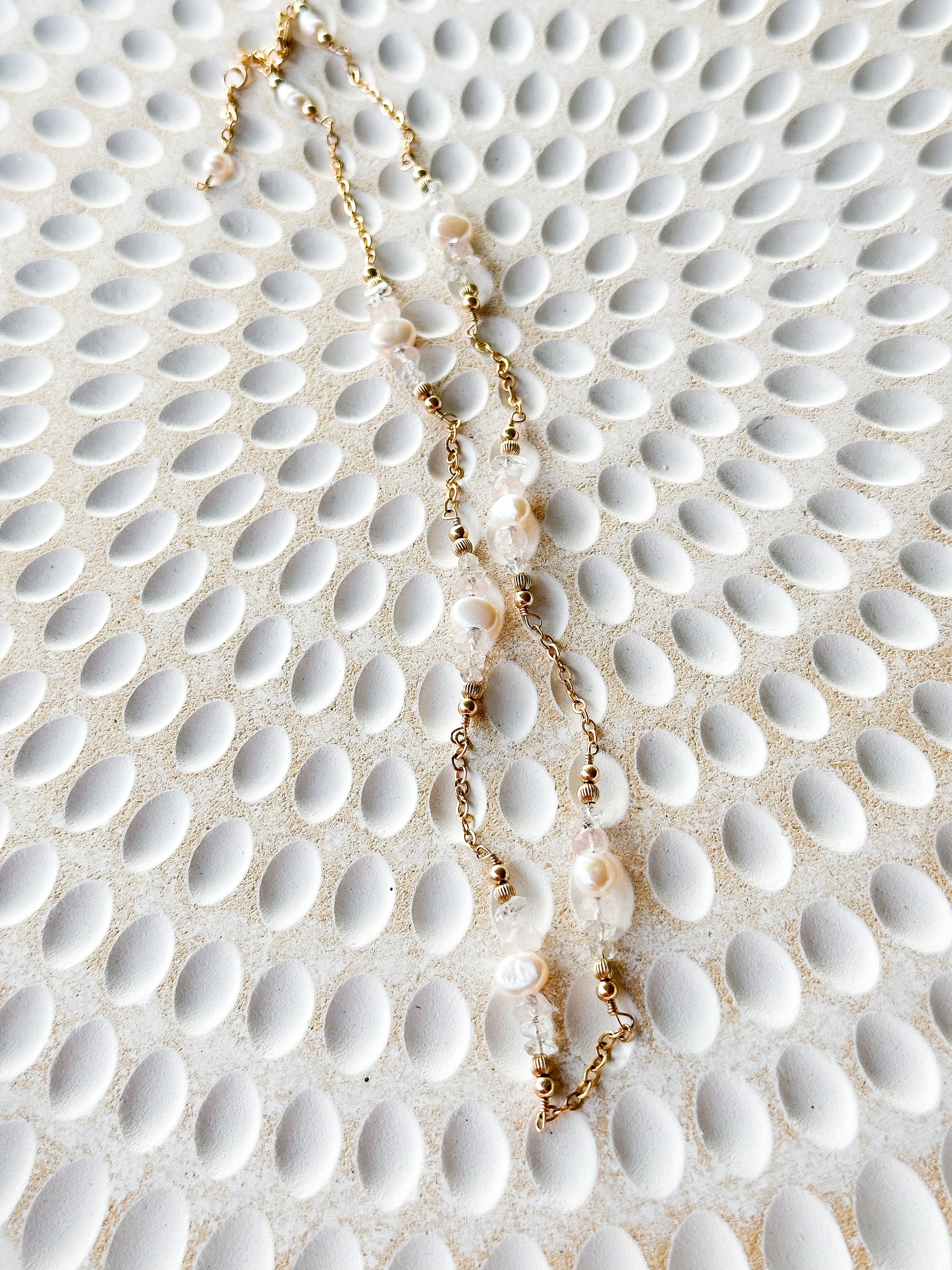 Add a pop of color to your jewellery collection with this Natural Freshwater Pearl, Herkimer Diamond and Rose Quartz necklace!