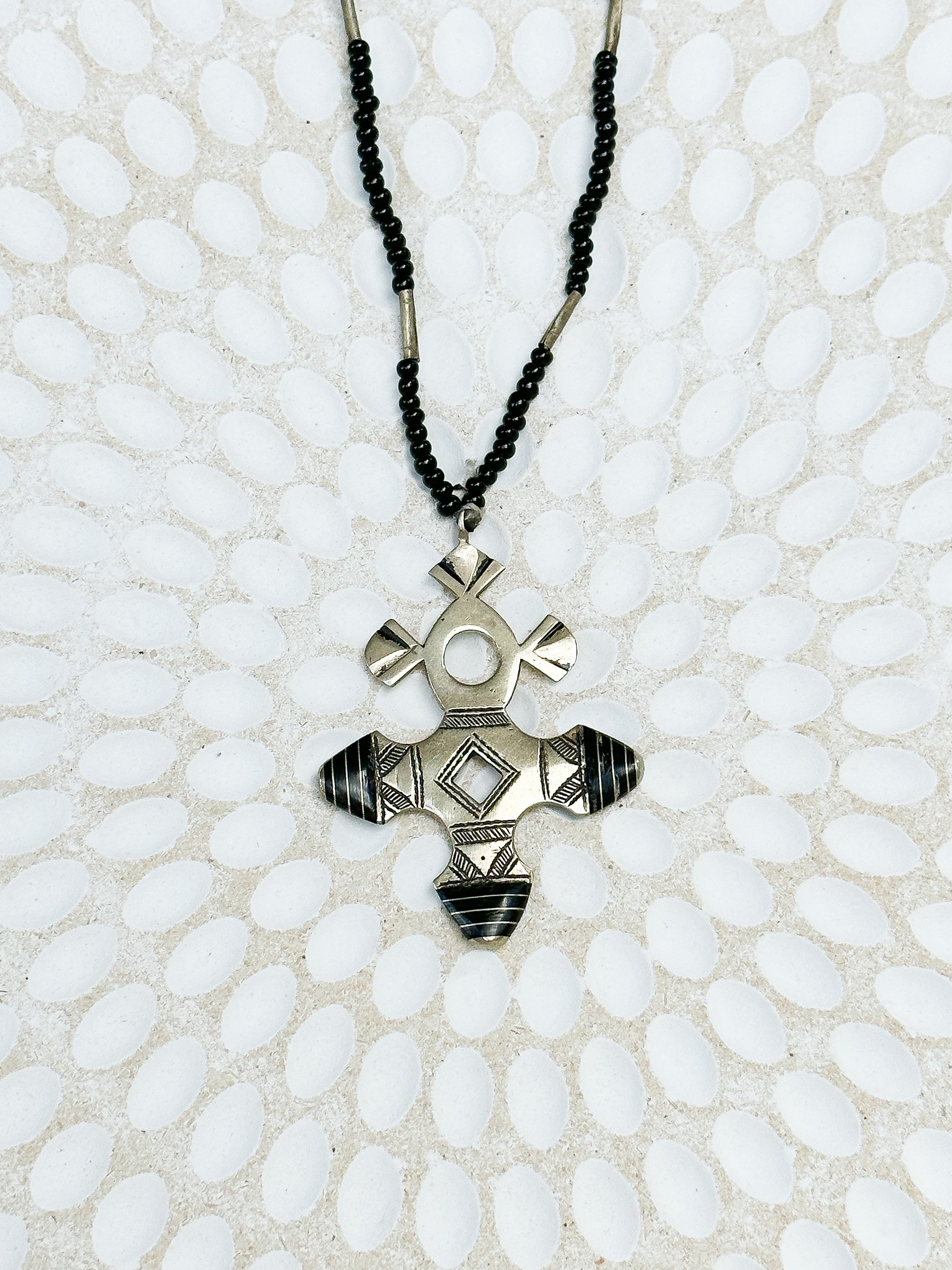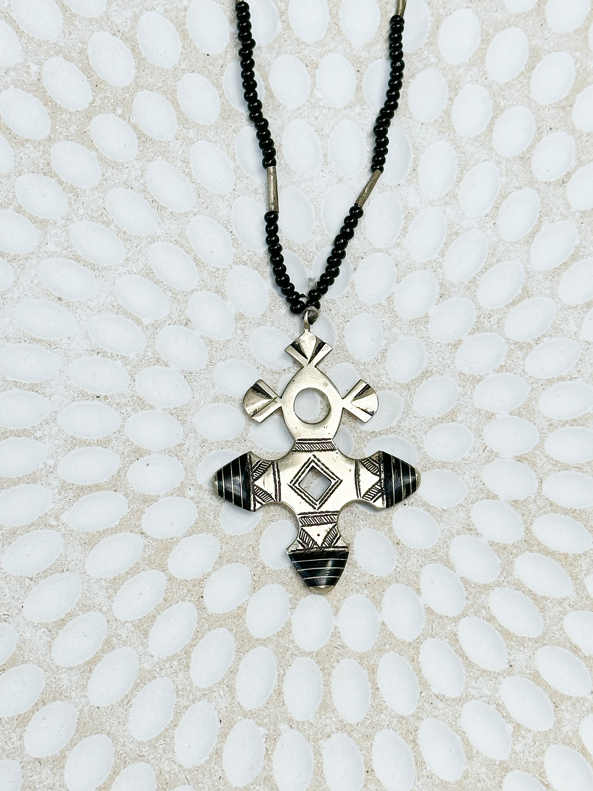 This Tuareg cross necklace is handmade, with sohpisticated engraving decorating the corners of the design. Small onyx beads interspersed with silver tube beads lead to a hand-engraved silver alloy pendant with ebony and silver stacked in the signature Tuareg style. Not a commonly seen design, similar to a Bartchakea cross.