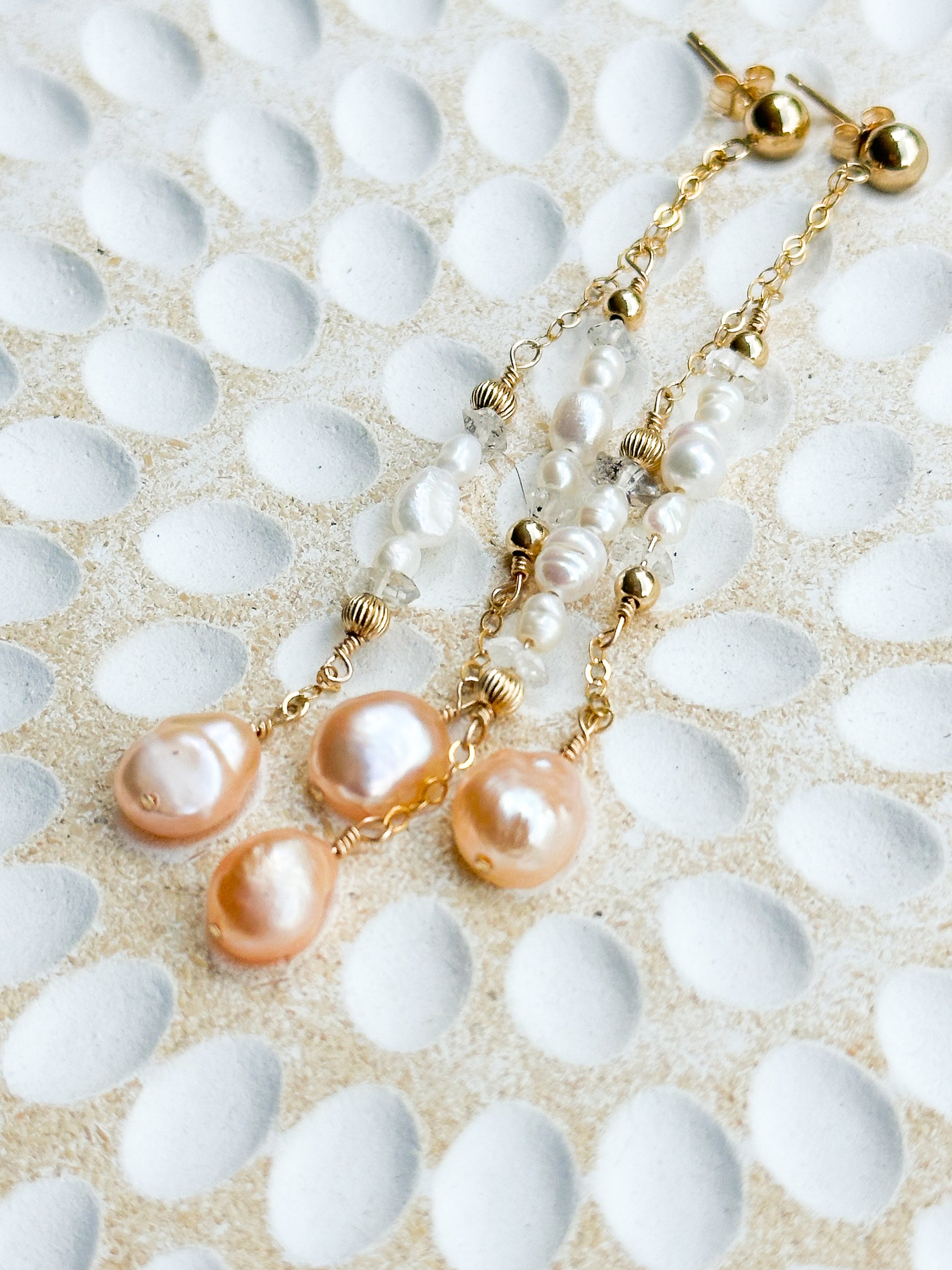 Designed to manifest intention and love, these gorgeous earrings look stunning on a night out, or worn down the aisle! The soft peach genuine pearls are stunning with the most gorgeous hue. These are sure to be your jewellery box favourite for years to come.